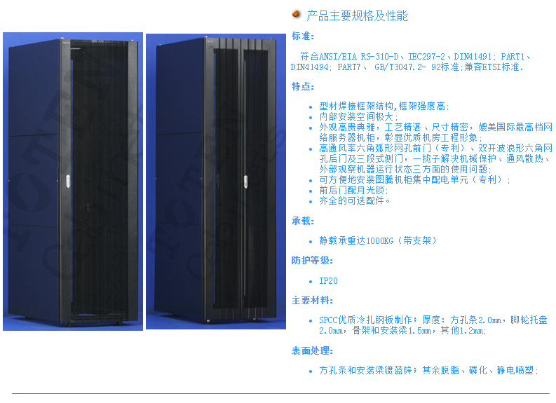 型材焊接框架结构,框架强度高; 内部安装空间极大; 外观高贵典雅,工艺精湛、尺寸精密,媲美国际最高档网络服务器机柜,彰显优质机房工程形象; 高通风率六角弧形网孔前门(专利)、双开波浪形六角网孔后门及三