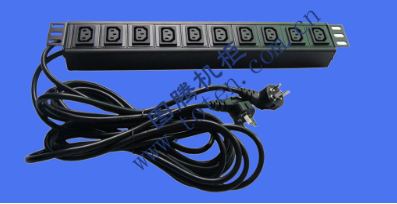 黑色10位国标PDU,10A国标三扁插头输入,IEC320 C13插座10A输出,无开关,线长3M,左端双路输入,19"正方向安装