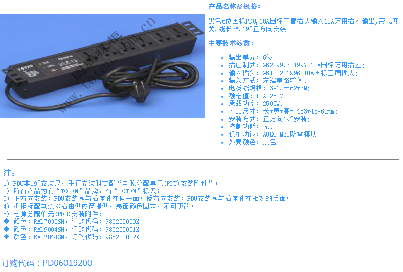 黑色6位国标PDU,10A国标三扁插头输入10A万用插座输出,带总开关,线长3M,19"正方向安装
