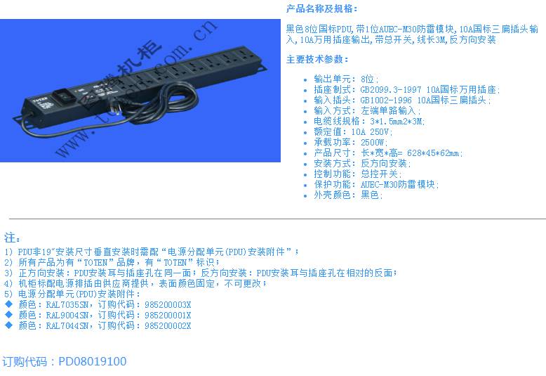 黑色8位国标PDU,带1位AUEC-M30防雷模块,10A国标三扁插头输入,10A万用插座输出,带总开关,线长3M,反方向安装