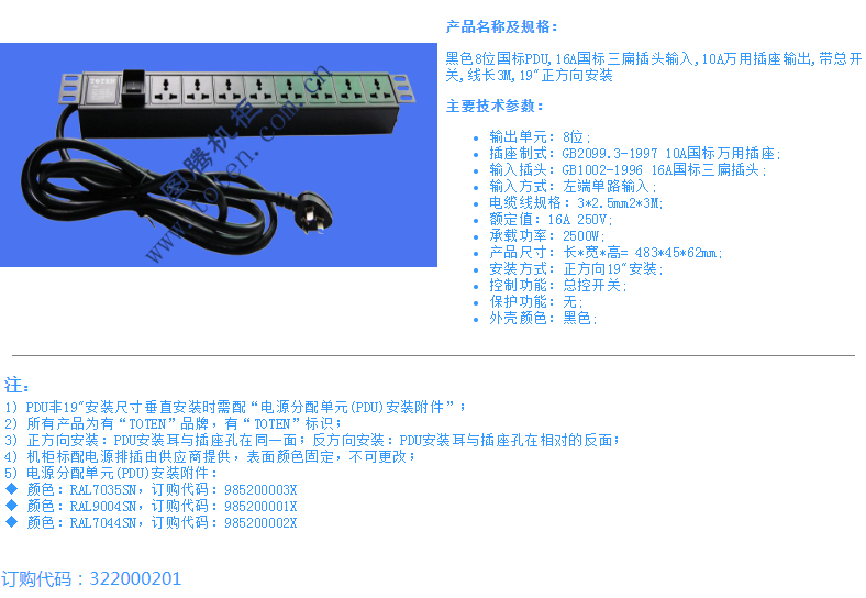 黑色8位国标PDU,16A国标三扁插头输入,10A万用插座输出,带总开关,线长3M,19"正方向安装